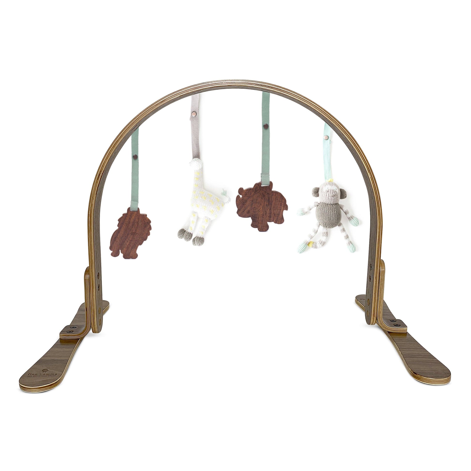 Get ready for the best play date ever! Our height-adjustable play gym has a 100% birch wood frame finished with non-toxic stains and lacquers. The wooden teething toys are made from untreated Indian hardwood and finished with vegetable seed wax. The knit toys were hand-knit at an artisanal women's collaborative in Peru using G.O.T.S. certified organic cotton yarn. All play gym dolls are removable—they can be used away from the gym as stroller or carseat toys and all of our "Stroller Toys" fit on the gym! Best of all, they'll never need a ride home at the end of the play date.